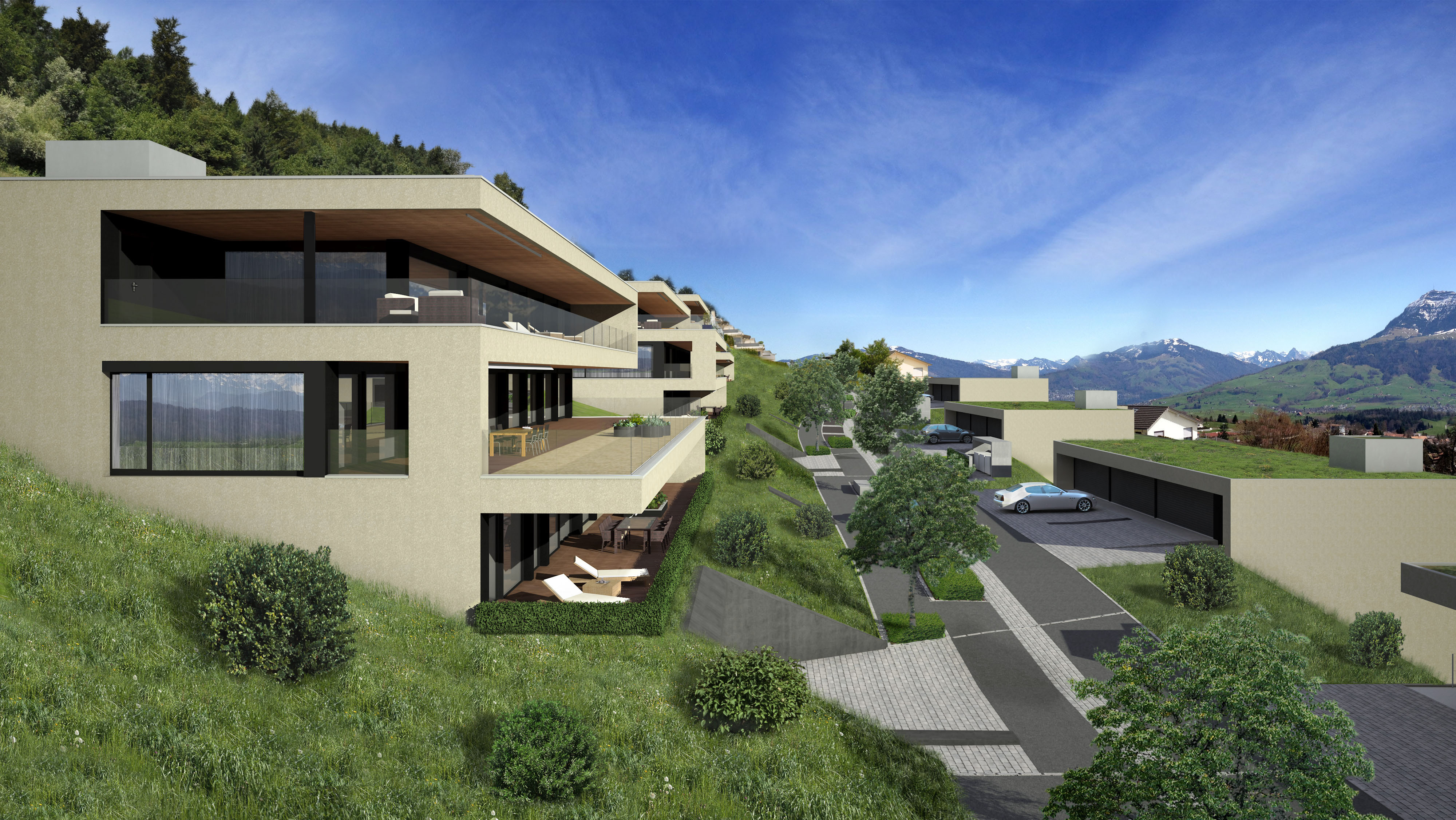 Sie erreichen Ihre Wohnung bequem und gut geschützt über das interne Treppenhaus mit dem Lift. Ohne Aussenzugänge orientiert sich die Gestaltung der Umgebungsflächen am ursprünglichen Hangverlauf. Dadurch geniessen Sie auf den sehr grosszügigen Terrassen neben einer atemberaubenden Aussicht auch ein Maximum an Privatsphäre. Die Wohnstrasse ohne Durchgangsverkehr wird durch Pflanzflächen, Belagswechsel und Fahrbahnverengungen zum Aufenthaltsbereich.