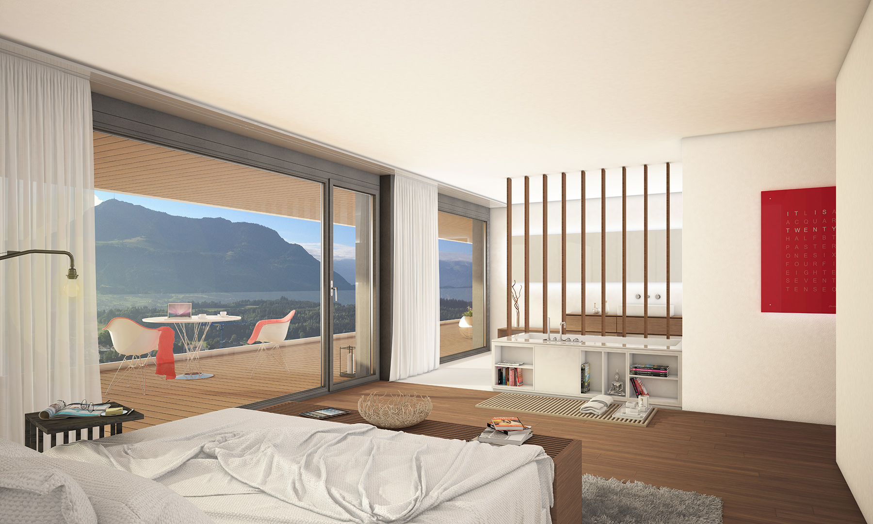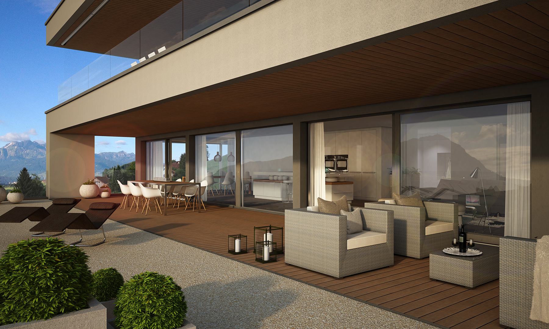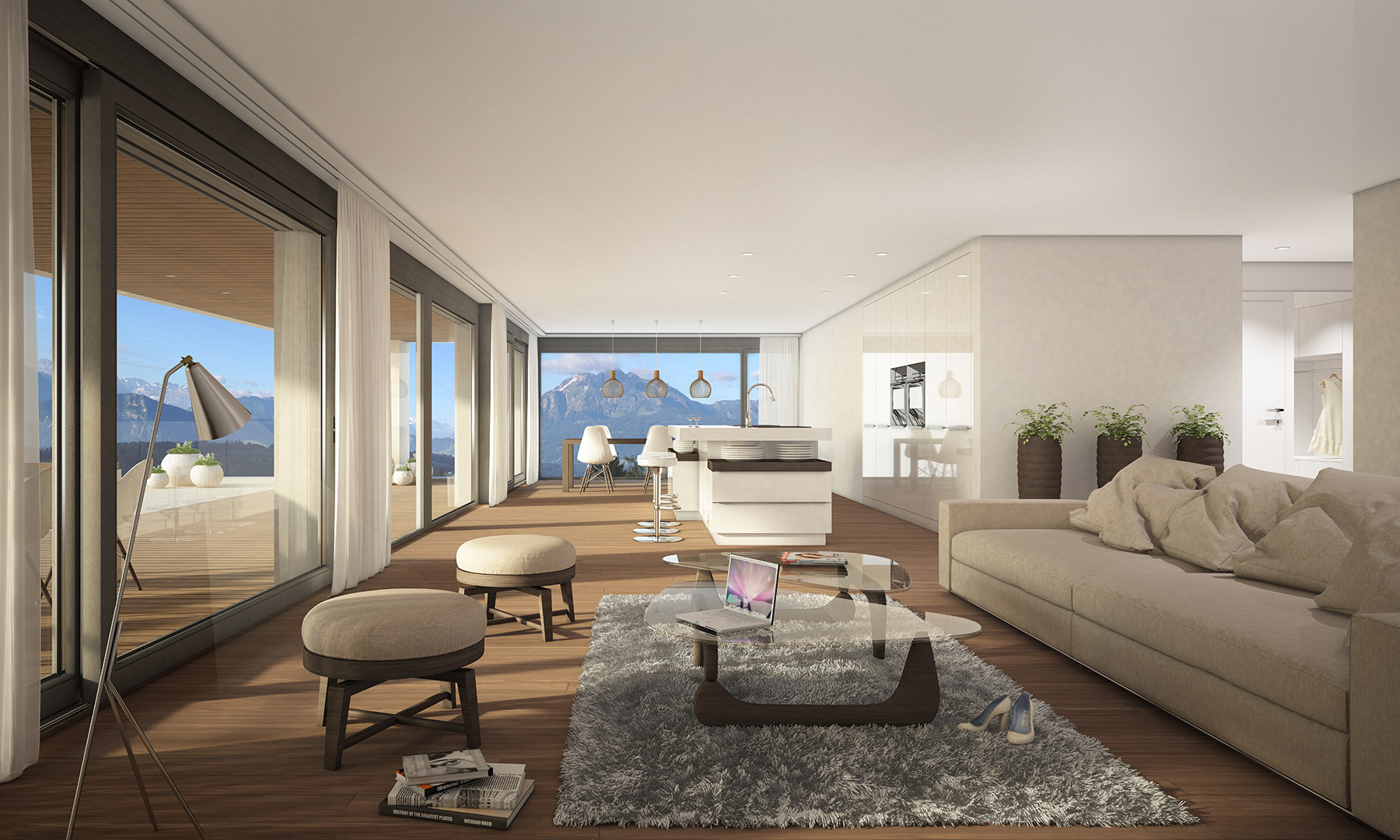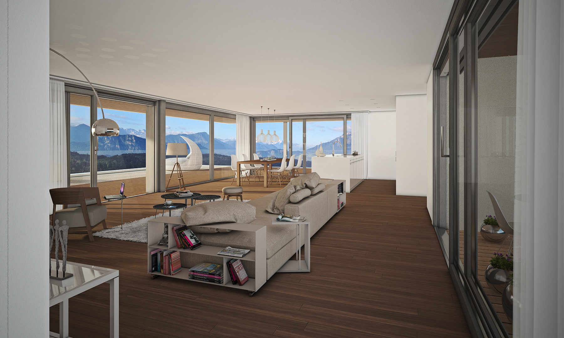 Die Bewohner der grosszügig konzipierten Terrassenwohnungen dürfen sich auf eine spektakuläre und unverbaubare Aussicht auf das gesamte Alpenpanorama - vom Zugersee über die Rigi bis zum Pilatus und eine Fernsicht bis weit in die Berner Alpen - freuen.