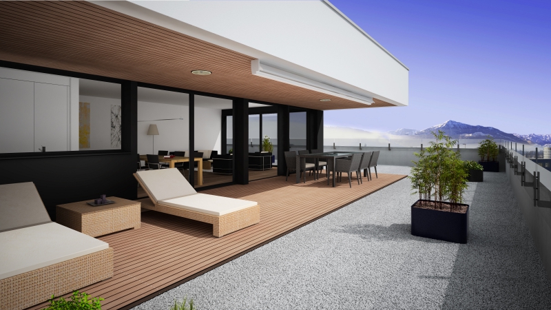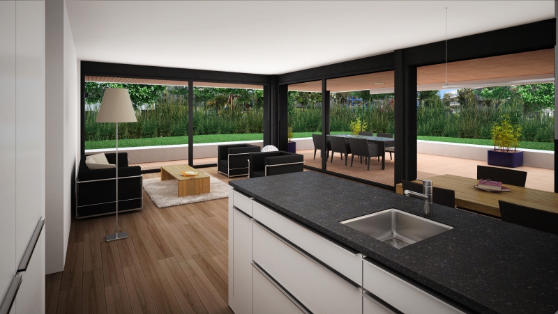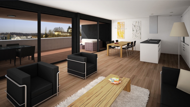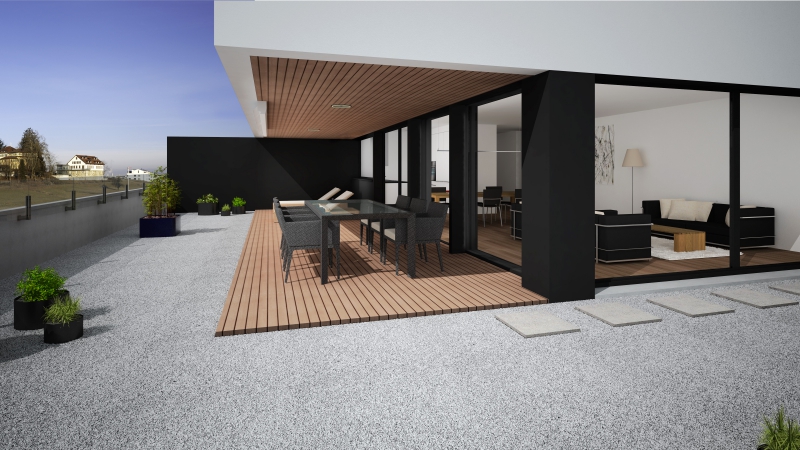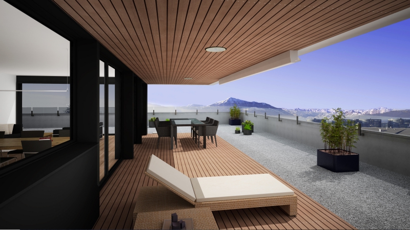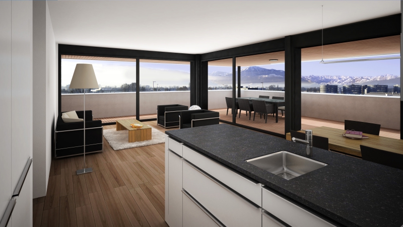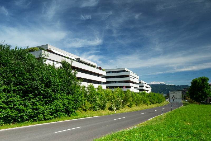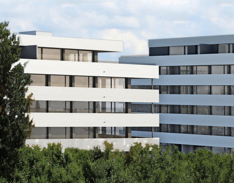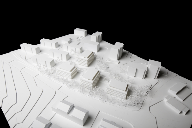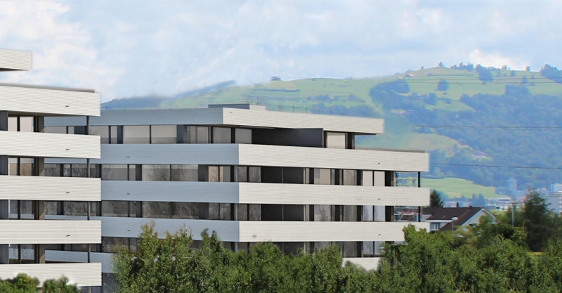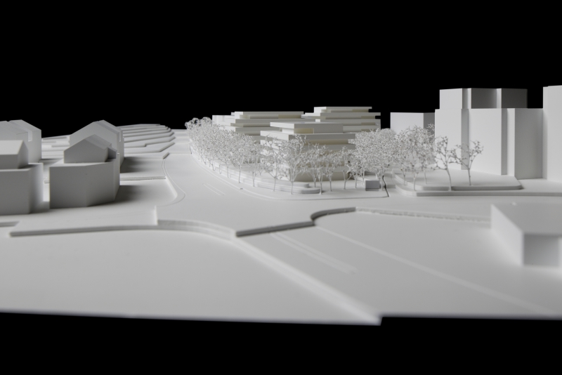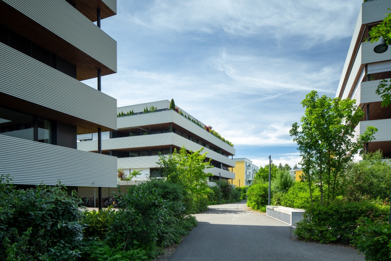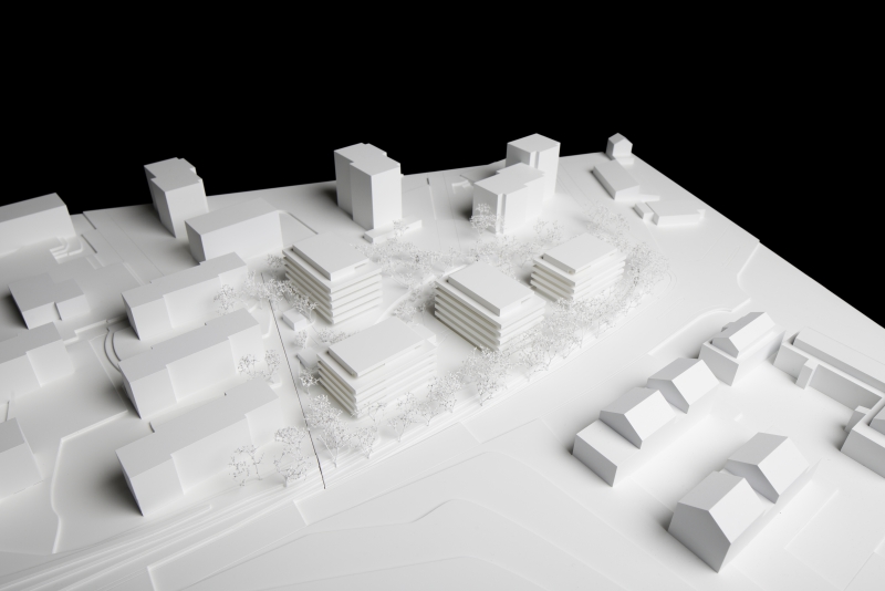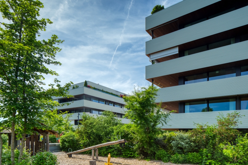 Um optimal auf die Gegebenheiten des Ortes, die Topographie, sowie auf die Massstäblichkeit der Überbauungen in der Nachbarschaft zu reagieren und um eine städtebaulich, wie auch architektonisch vorzügliche Lösung für das Siedlungsbild und die Gestaltung der Umgebung zu erreichen, wurden die Geschossflächen auf lediglich vier Bauvolumen verteilt. Die Architektursprache aller vier Baukörper reduziert sich konsequent auf die horizontale Schichtung der rundumlaufenden Balkonbrüstungen, welche einerseits konzeptionellen Schallschutz für die zurückversetzten Wohn- und Schlafräume bieten und andererseits die Gebäudemasse optisch leicht wirken lassen. Die Setzung der einzelnen teilweise 4 bis 5-geschossigen Baukörper (Vollgeschosse) schafft die städtebaulich angestrebte Ensemblewirkung mit grossen zusammenhängenden Freiräumen zwischen den einzelnen Bauten und gegenüber den Nachbarschaften, erreicht aber auch optimale Ausrichtungen der einzelnen Wohneinheiten. So entstehen wohlproportionierte Aussenräume und konzeptionell bedingt eine bewusste Gewichtung des grosszügigen Quartierplatzes zwischen den geplanten Bauvolumen und den höher geschossigen Mehrfamilienhäusern in der Nachbarschaft im Südosten. Dies ermöglicht die Zuweisung geeigneter Spielflächen. Es ergeben sich vielfältige Sichtbezüge und unterschiedlich stark definierte Aussenräume. Diese Einheitlichkeit der Bebauung wird durch den Umgang mit den Aussenräumen ver-stärkt. Im Sinne einer naturnahen Gestaltung der Freiräume, welche die Bauten umge-ben, werden mit dem Einbezug des teilweise bereits heute bestehenden, bepflanzten Erdwalles entlang der Knonauerstrasse ein natürlicher Lärm-/ und Sichtschutz und gleichzeitig ein klarer Abschluss der Siedlung zur Umfahrungsstrasse geschaffen.