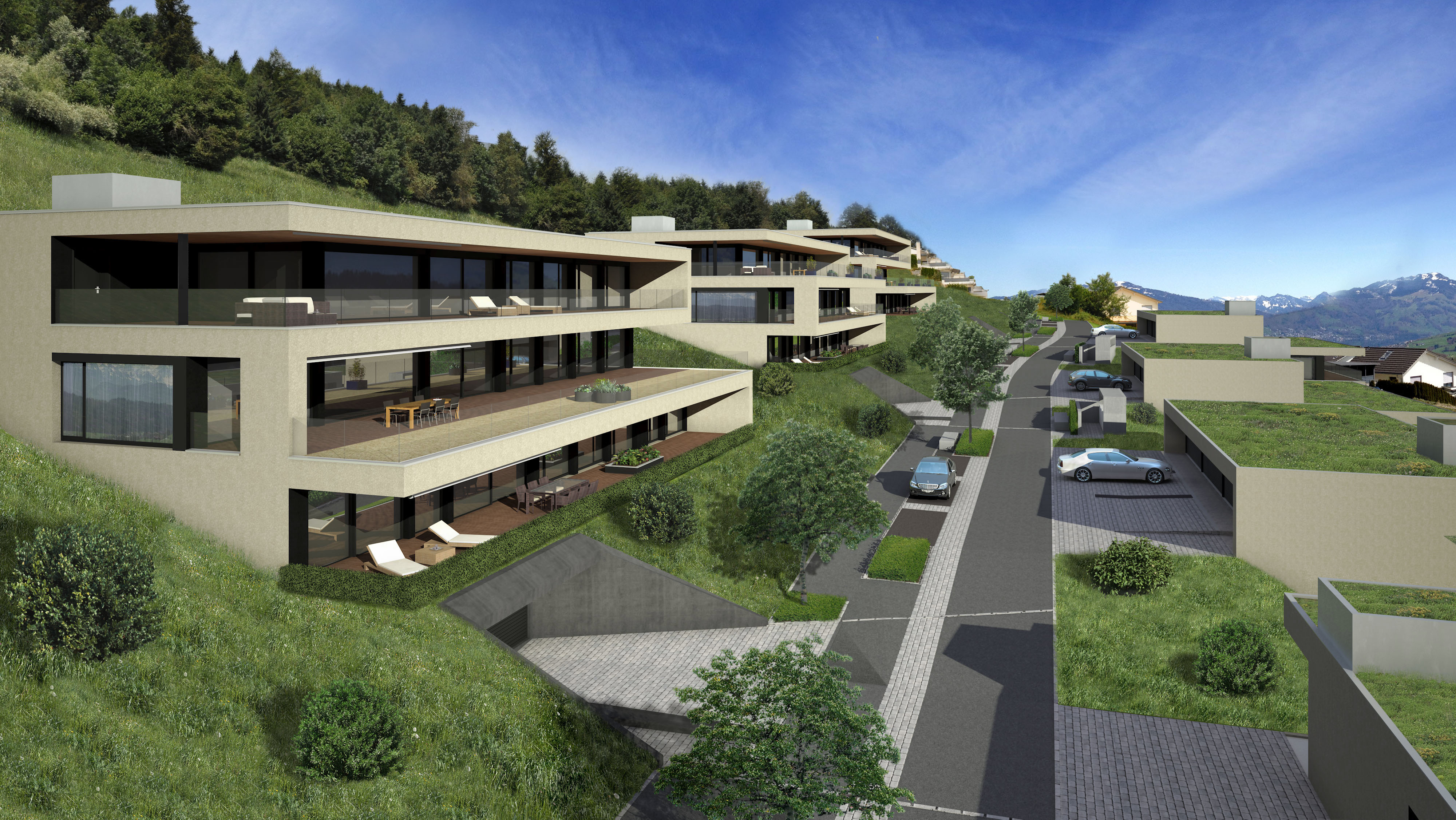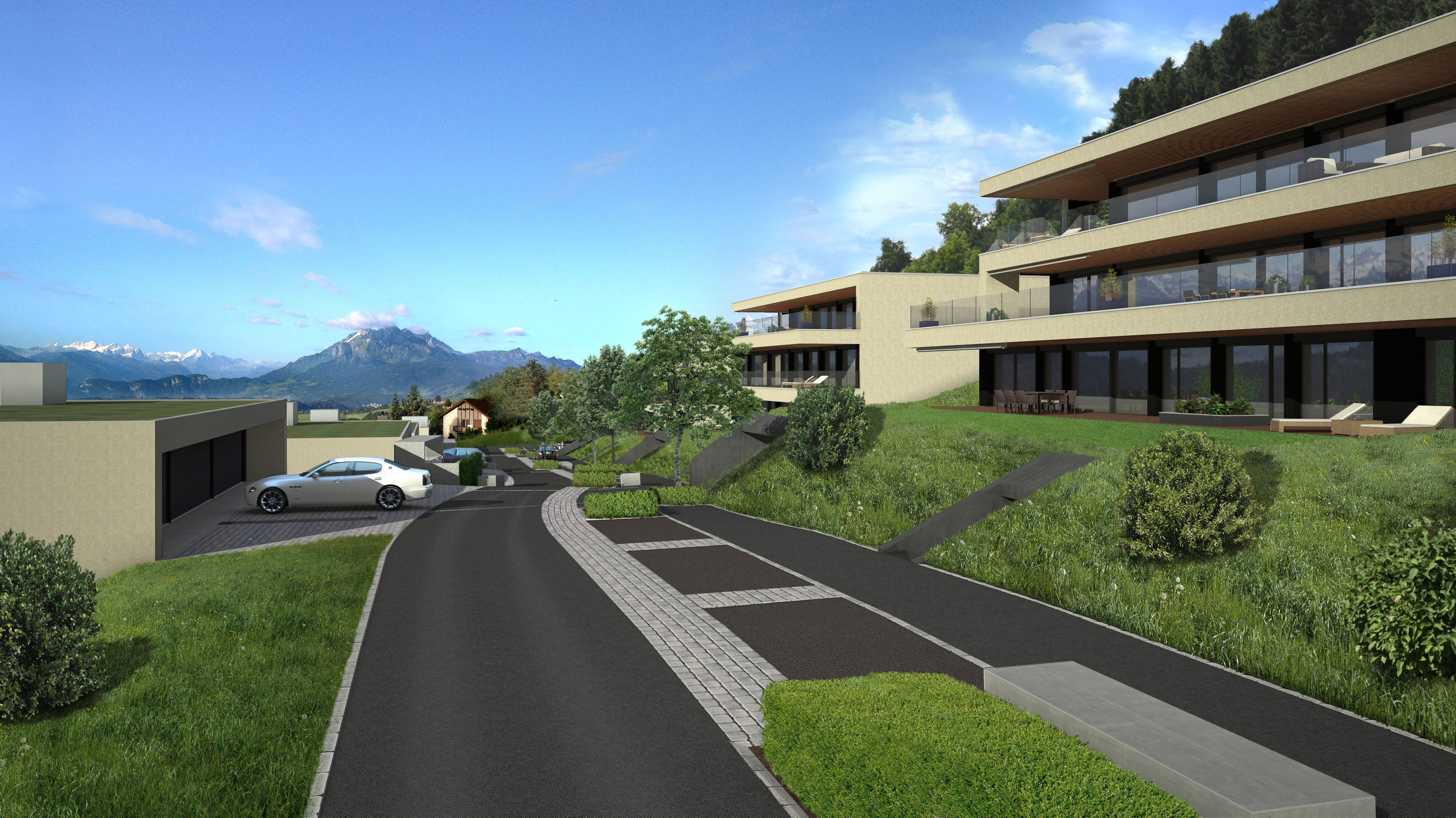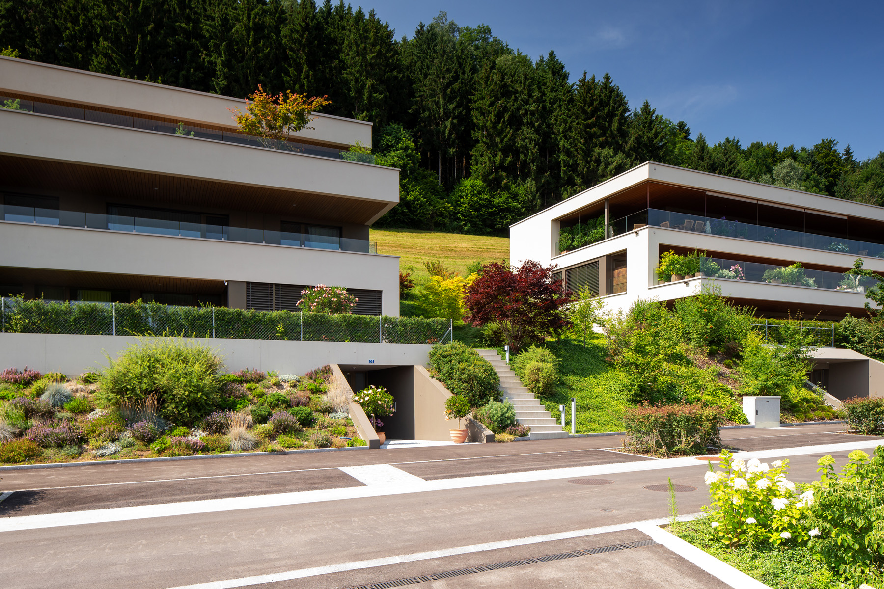 Sie erreichen Ihre Wohnung bequem und gut geschützt über das interne Treppenhaus mit dem Lift. Ohne Aussenzugänge orientiert sich die Gestaltung der Umgebungsflächen am ursprünglichen Hangverlauf. Dadurch geniessen Sie auf den sehr grosszügigen Terrassen neben einer atemberaubenden Aussicht auch ein Maximum an Privatsphäre. Die Wohnstrasse ohne Durchgangsverkehr wird durch Pflanzflächen, Belagswechsel und Fahrbahnverengungen zum Aufenthaltsbereich.
