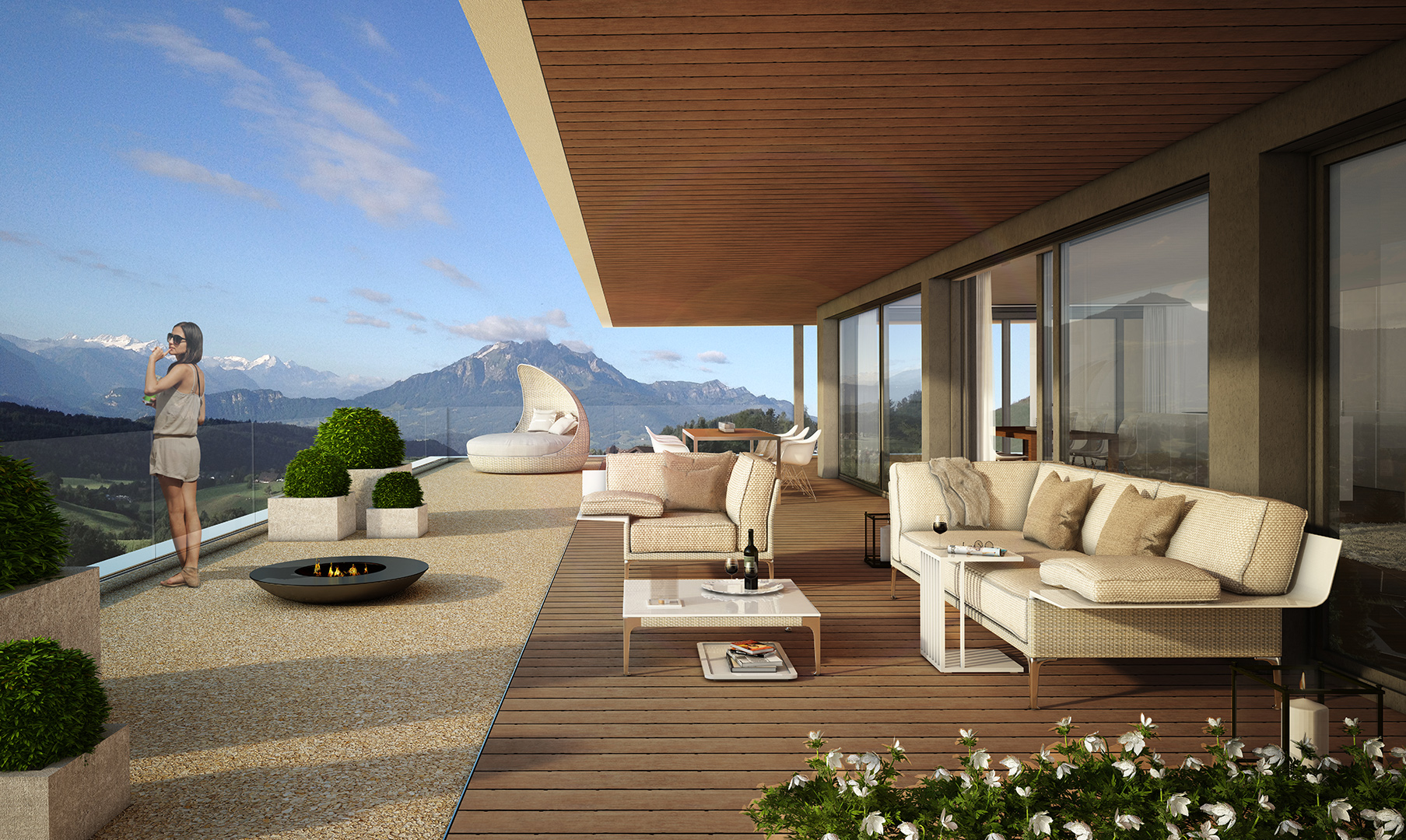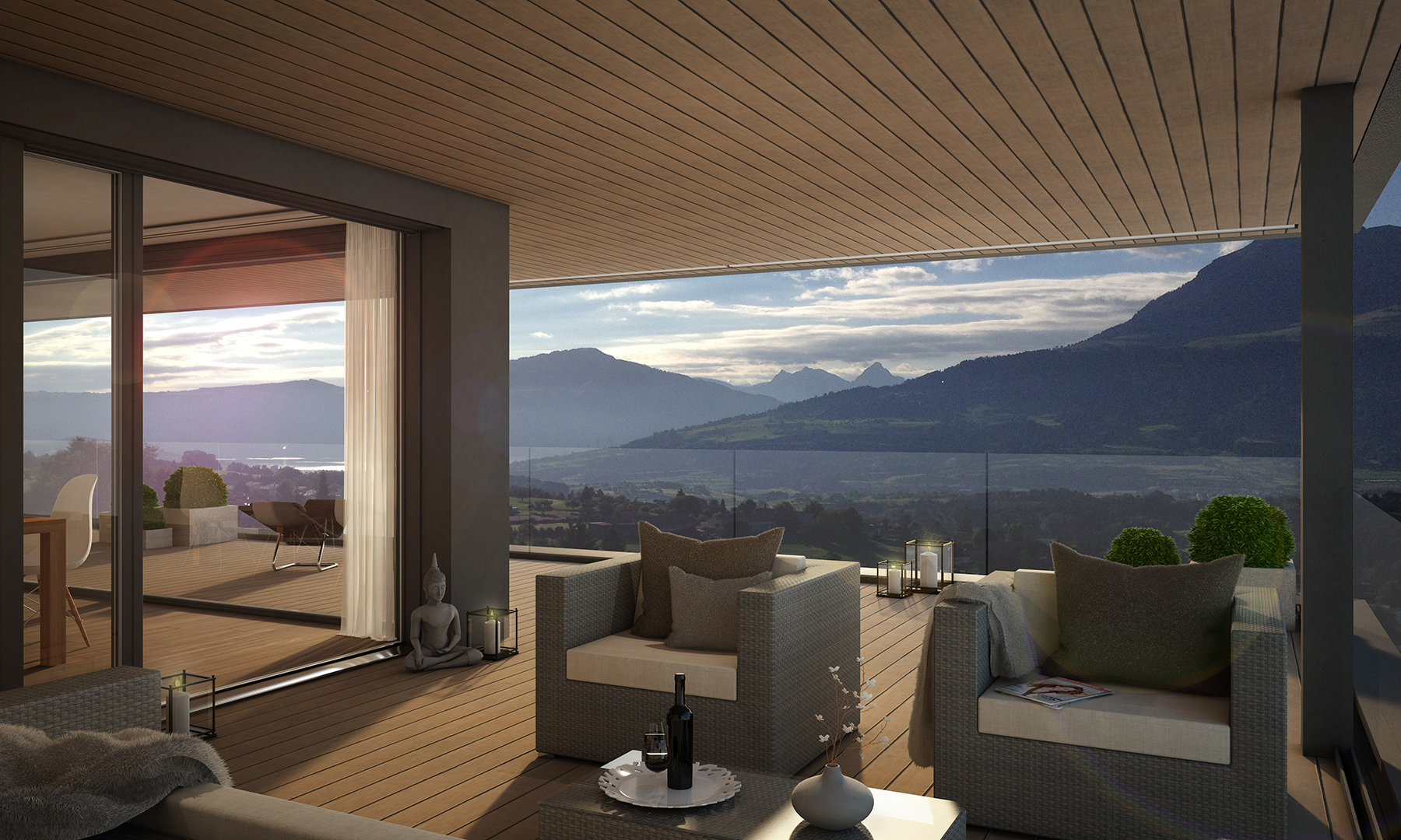 Die Bewohner der grosszügig konzipierten Terrassenwohnungen dürfen sich auf eine spektakuläre und unverbaubare Aussicht auf das gesamte Alpenpanorama - vom Zugersee über die Rigi bis zum Pilatus und eine Fernsicht bis weit in die Berner Alpen - freuen.